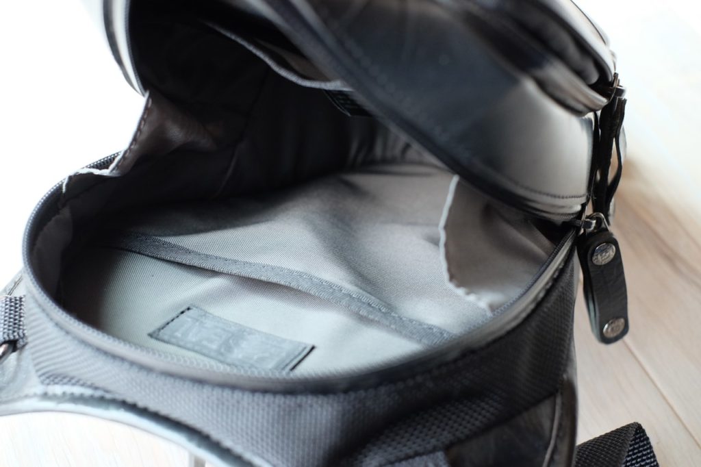 ジッパー付ポケットと手前にもポケットがあるので、細かな仕訳が可能です。僕はここにお財布(マネークリップ)と家の鍵を入れています。イヤホンも入りました。