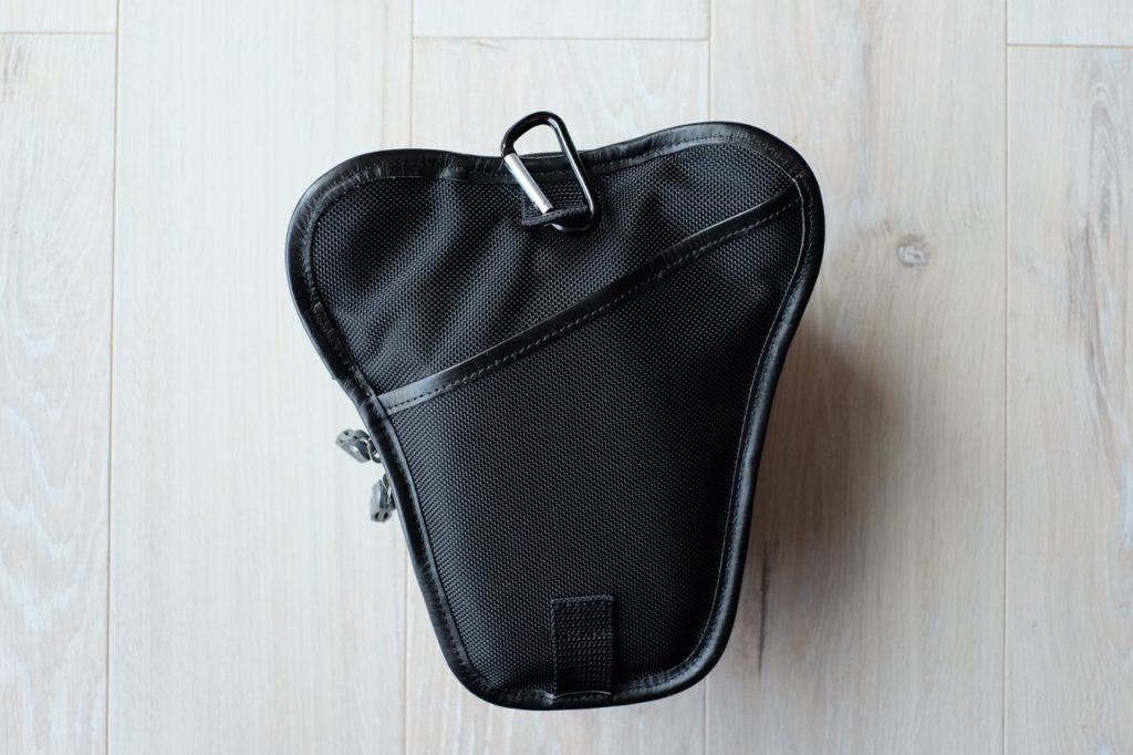裏にも隠しポケット。下部にある継ぎ目は、太もも固定用のベルト通しです。ここのポケットは腰に巻くと使えなくなるので、非常時用?僕は使うことは無いかと思います。