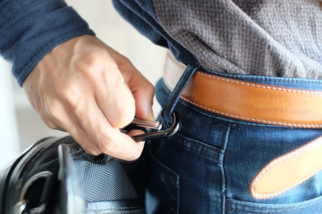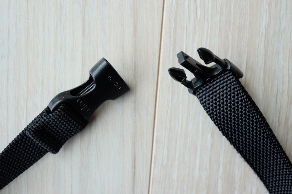 ウエストベルトのフックはこんな感じで留まります。安っぽさはないのですが、着脱が楽かは疑問。僕にとっては及第点。